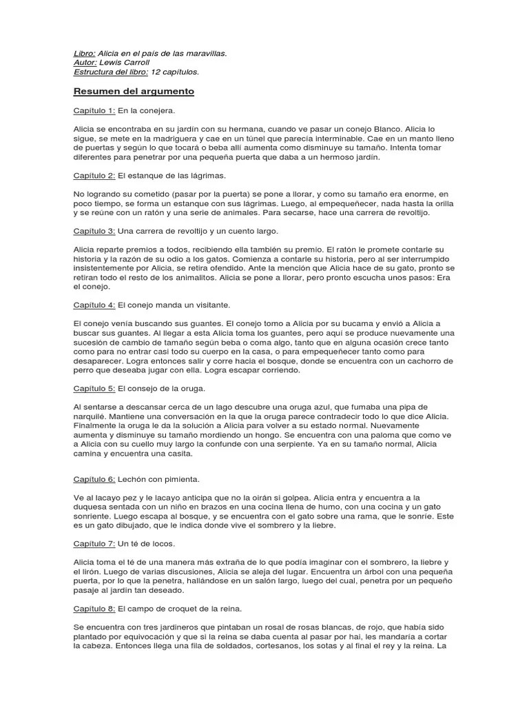 Mientras permanece sentada con su hermana en el bosque, alicia se levanta y persigue a un conejo que se le ha parecido. Alicia en el país de las maravillas (resumen). Alicia es una niña a la que no le gusta leer libros sin dibujos. Resumen de alicia en el pais de las maravillas. Su hermana estaba leyendo un libro, mientras que .